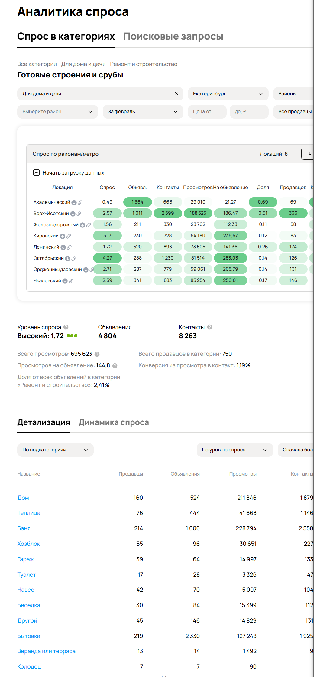 На основе данных аналитики спроса Avito за февраль по категории «Готовые строения и срубы» в Екатеринбурге я подготовил разбор ситуации на рынке и конкретные рекомендации для запуска или усиления продаж.